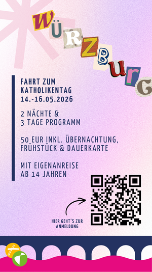 2 Übernachtungen und 3 Tage vor Ort direkt beim Katholikentag in Würzburg mit tollem Programm in der ganzen Stadt verteilt.